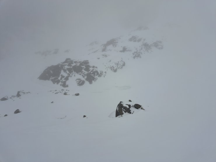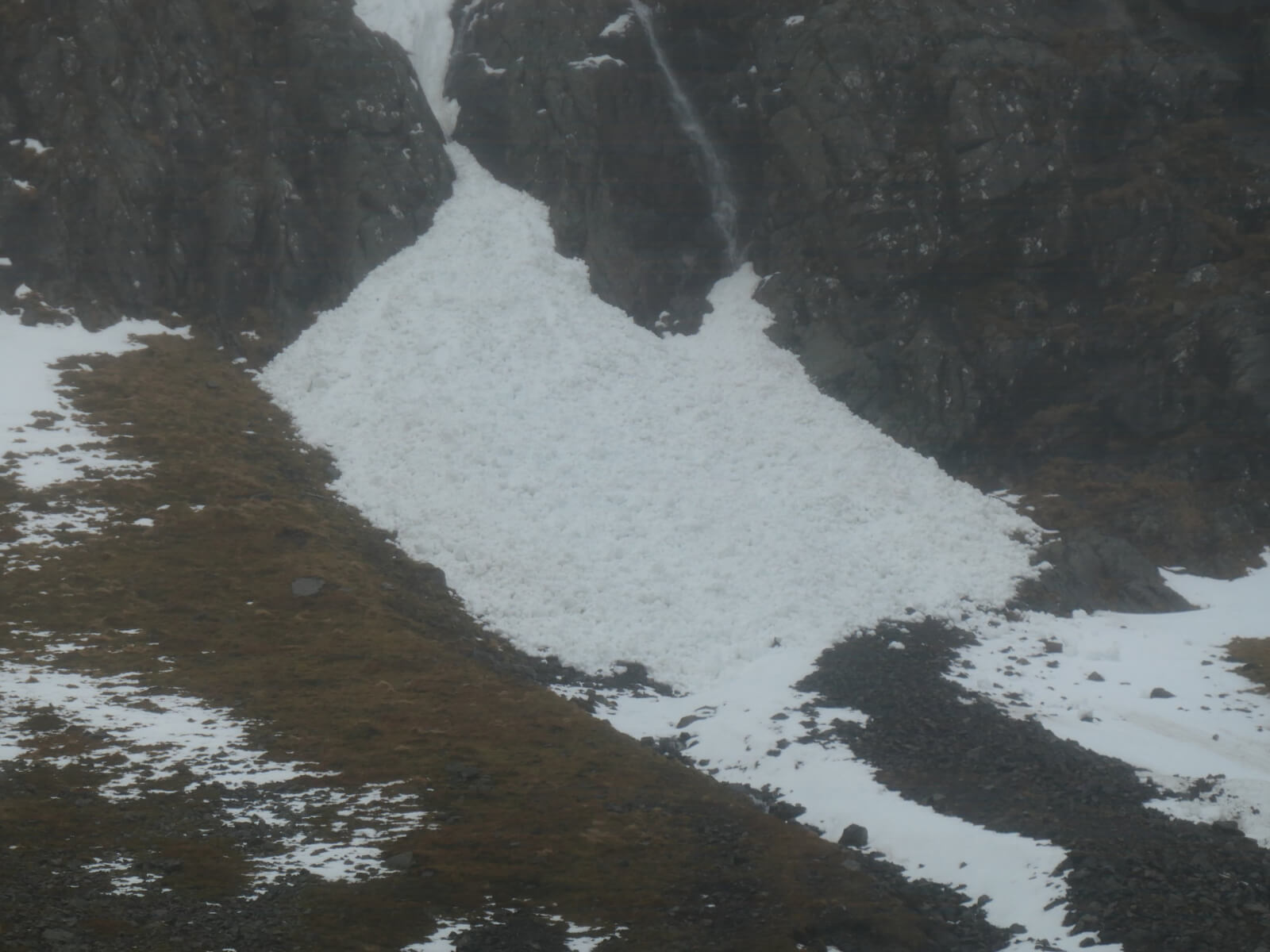 This morning was just as forecast; mild, drizzly and poor visibility. The freezing level rose above the summits around midnight and there was some drizzle. These are good conditions for triggering avalanches in the unstable windslab that was there yesterday, either directly or from cornice collapse which is very likely in these conditions. I decided to go into Coire na Ciste on Ben Nevis to see if I could see any debris. Unfortunately visibility in the corrie was too poor to see much at all. On the way up I passed 2 other areas which frequently avalanche; the Castle gullies and Number 5 Gully. There was fresh debris at the bottom of both of these and I’d be very surprised if there weren’t quite a few other avalanches in the Lochaber area last night.