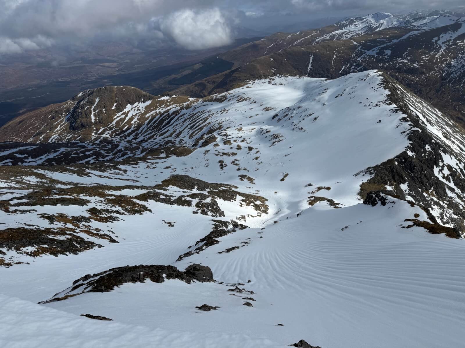 Coire Dubh, Aonach Mor with some of the crags above Coire an Lochain visible behind.