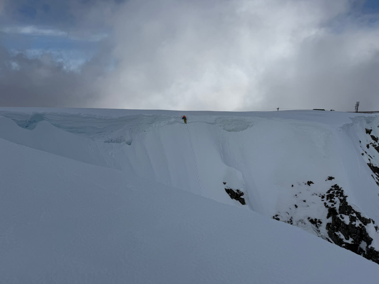 A climber descending into Easy Gully, Aonach Mor. Some cornices remain here.