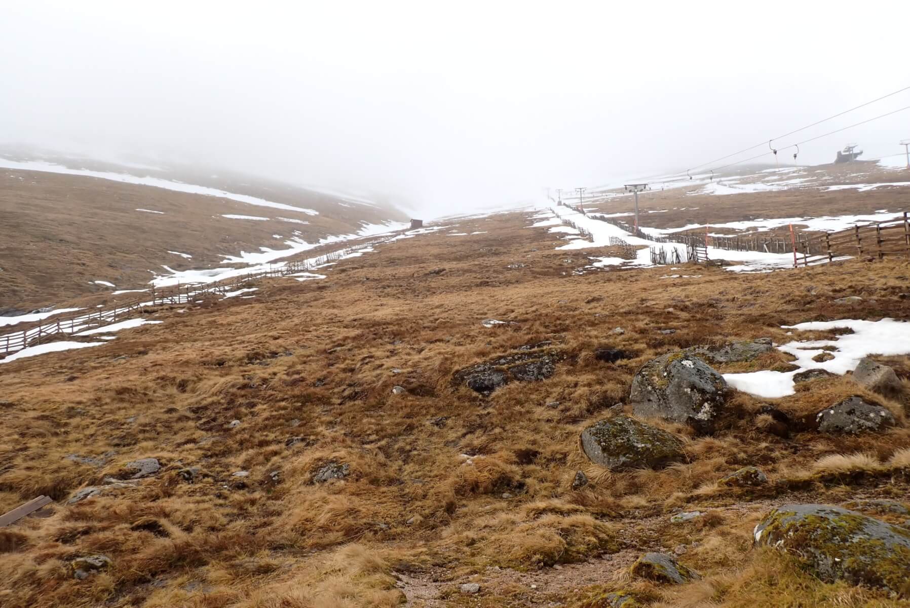Looking up the ski area at about 800 metres. Not looking too wintry. However, there is more snow cover in the higher coires than you might think based on this view.