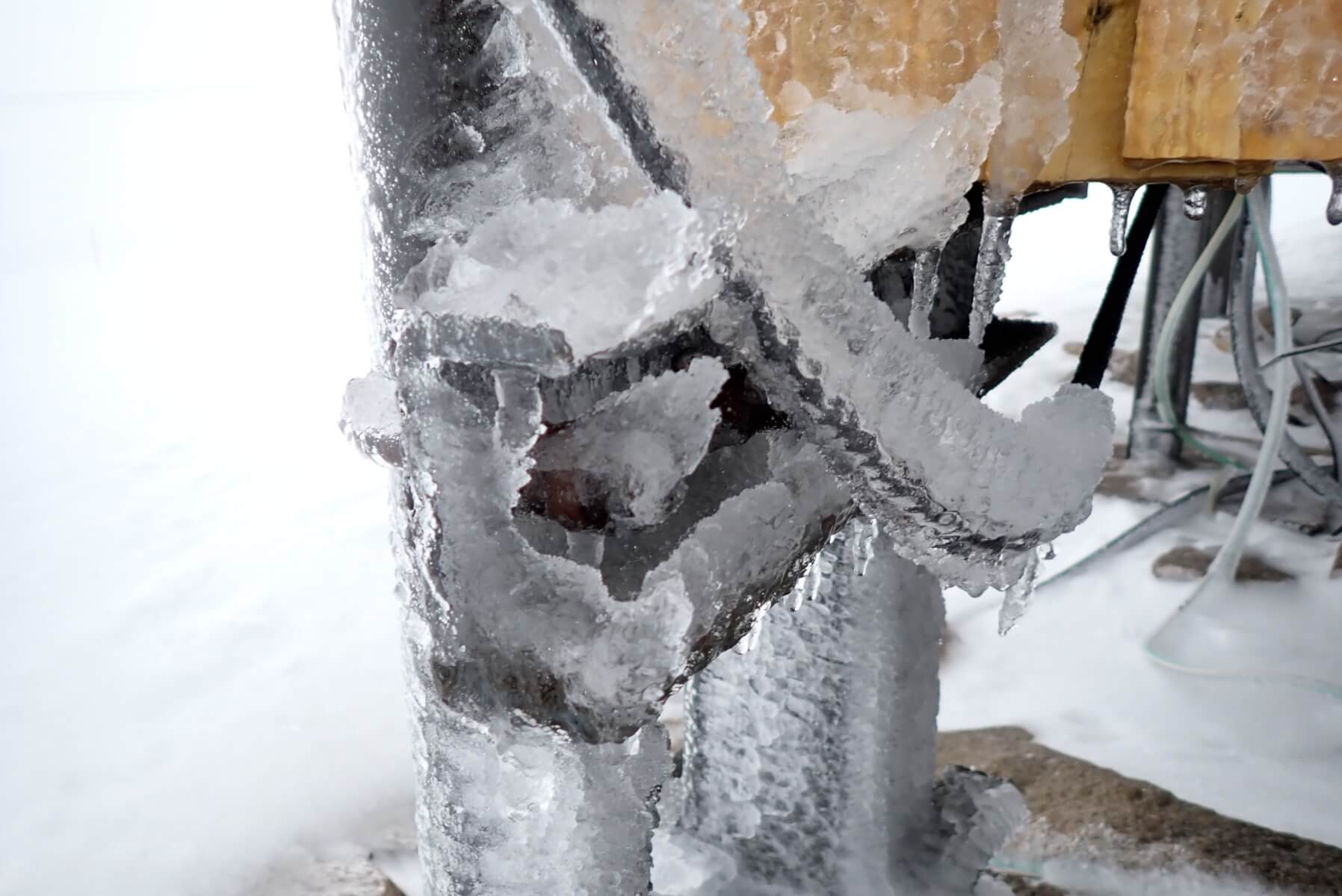 An layer of icy rime on the pillars supporting the summit hut that had formed early this morning. You often get clear icy rime when the atmosphere is very humid and the temperature just below freezing. The fact the temperature is just below freezing means that the water remains liquid long enough for trapped air to escape, leaving pure water to freeze into a layer of translucent ice. In colder conditions the supercooled water droplets freeze rapidly entraining a lot of air which produces a softer and more opaque/whiter type of rime ice.