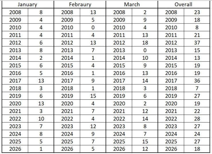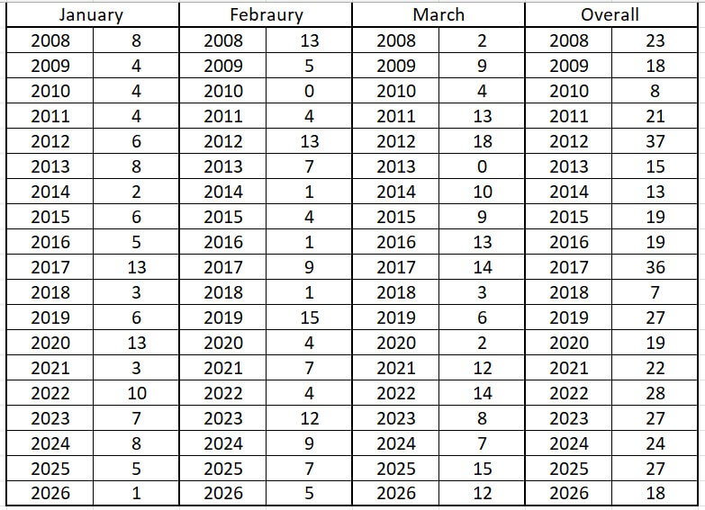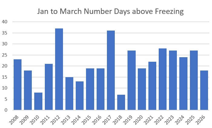 A graph showing the number of days above freezing on the summit at midday for the period January to March. The year to year variation looks much greater before about 2019.