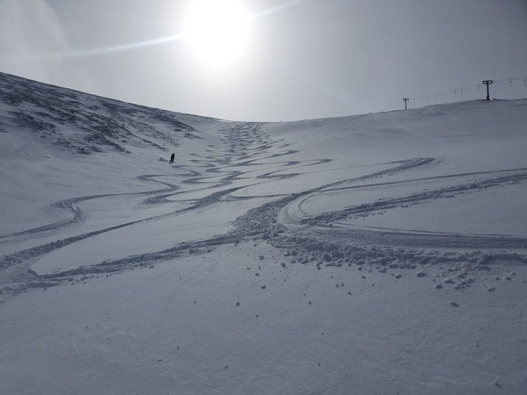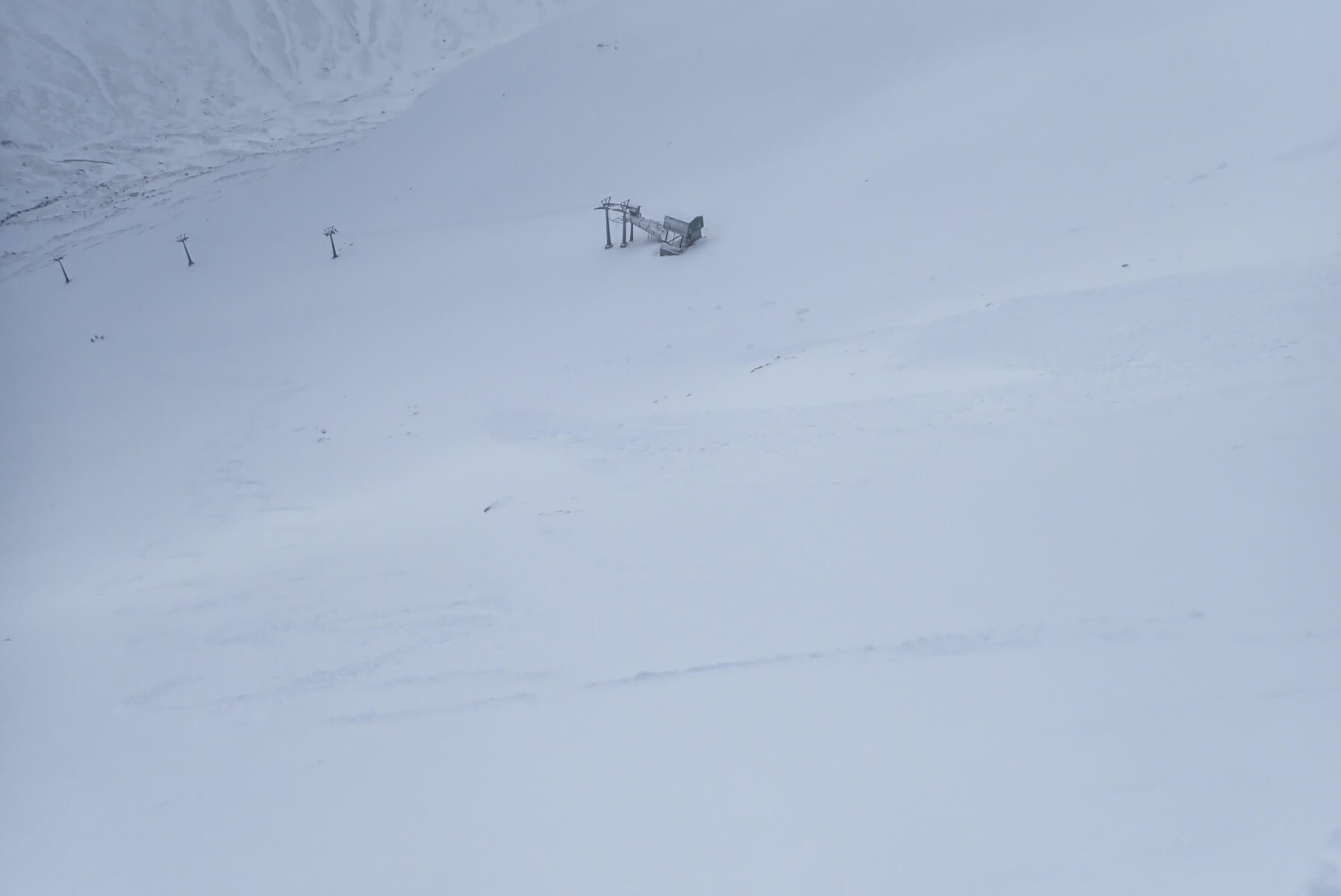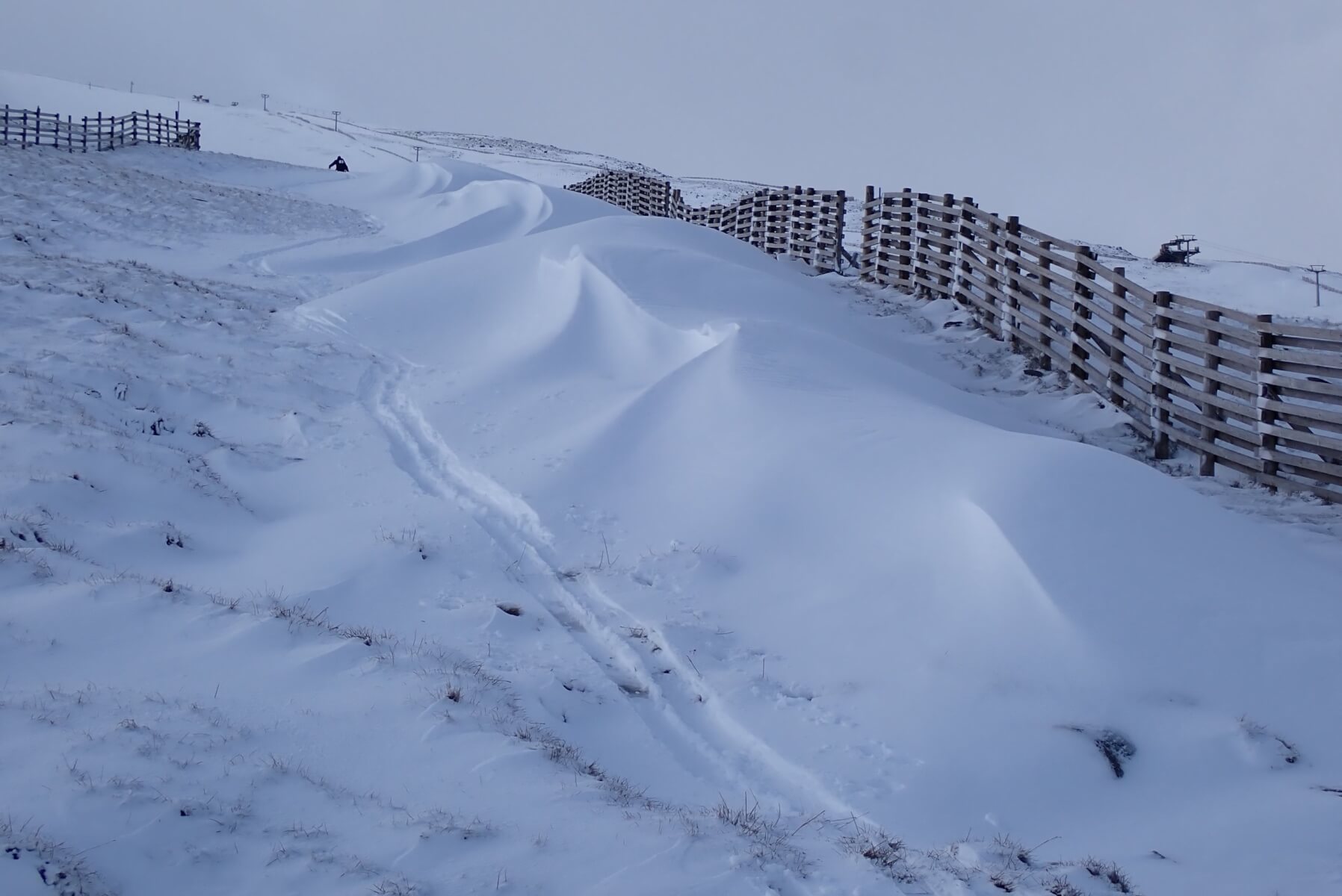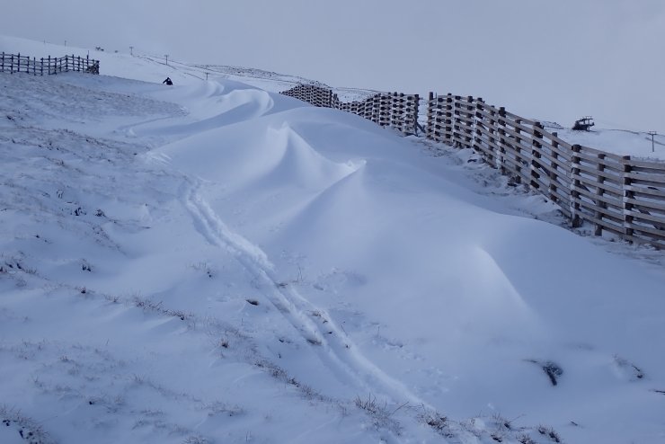 Snow fences caught yesterday’s snowfall at 750 metres. You can just see the last member of team early skinning up the hill. They looked to be able to get a run or two in before the visibility got too bad.