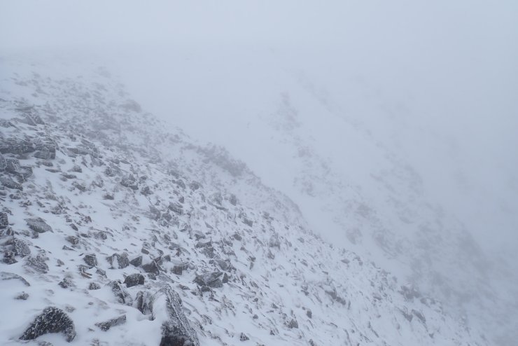 There was a brief clearing late morning when I was on my way down. Team not-so-early timed it well and found some nice snow. Within half an hour the cloud had rolled back in and visibility has dropped right off.