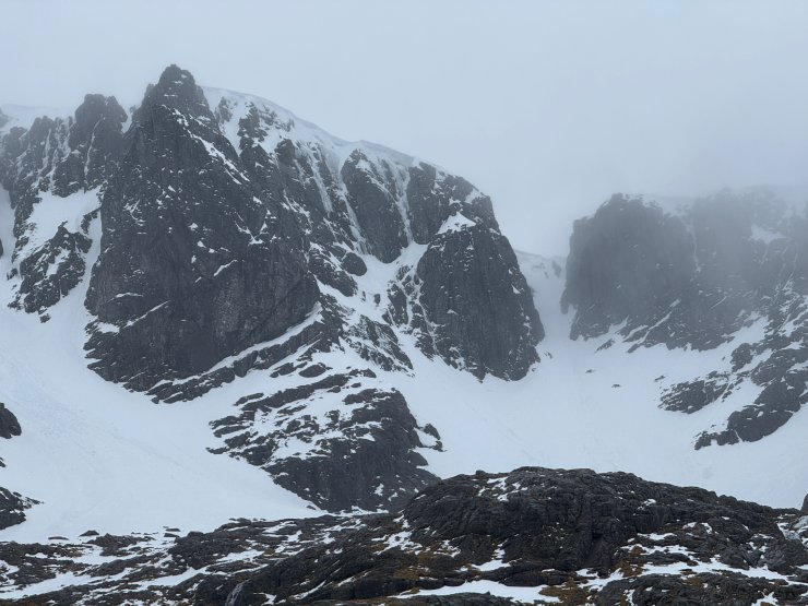 Mild temperatures and rain gave thaw conditions on Ben Nevis today. There were several surface instabilities noted, most likely caused by cornice collapse or icefall during the heavier rain last night. Some large cornices remain and will continue to be a hazard during milder spells.