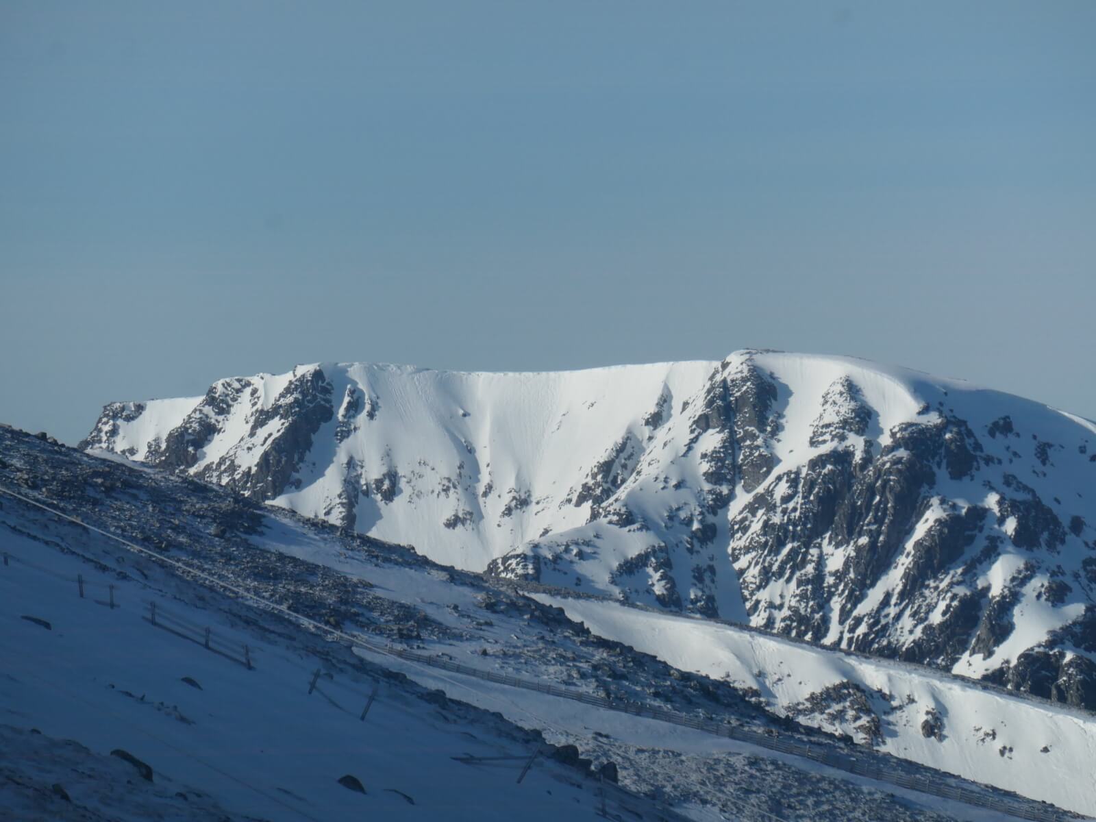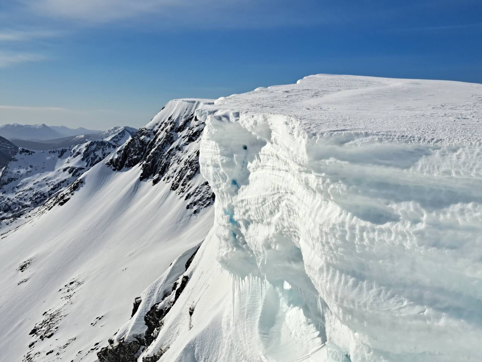 A lot of cornices collapsed on Tuesday and Wednesday but there are still some big overhanging cornices remaining. This one is above Coire an Lochan.