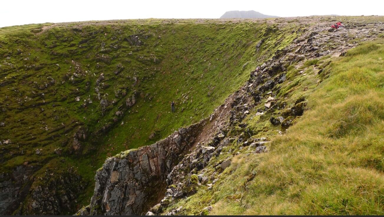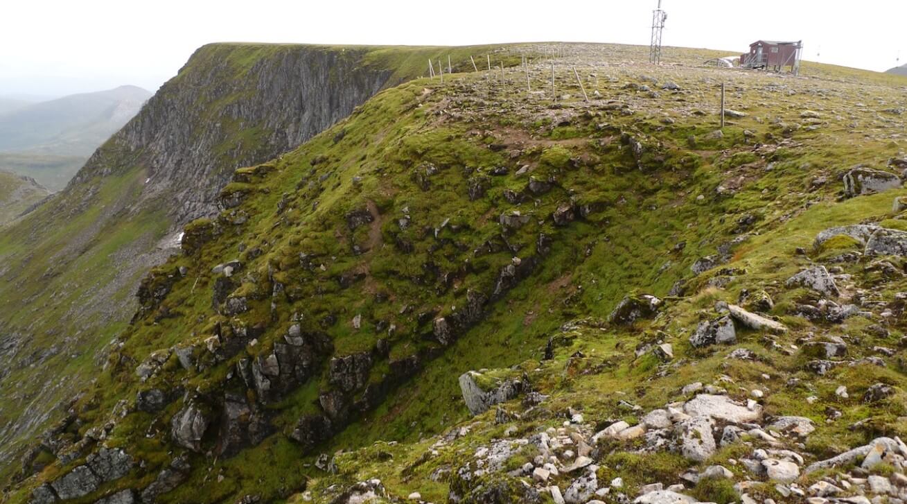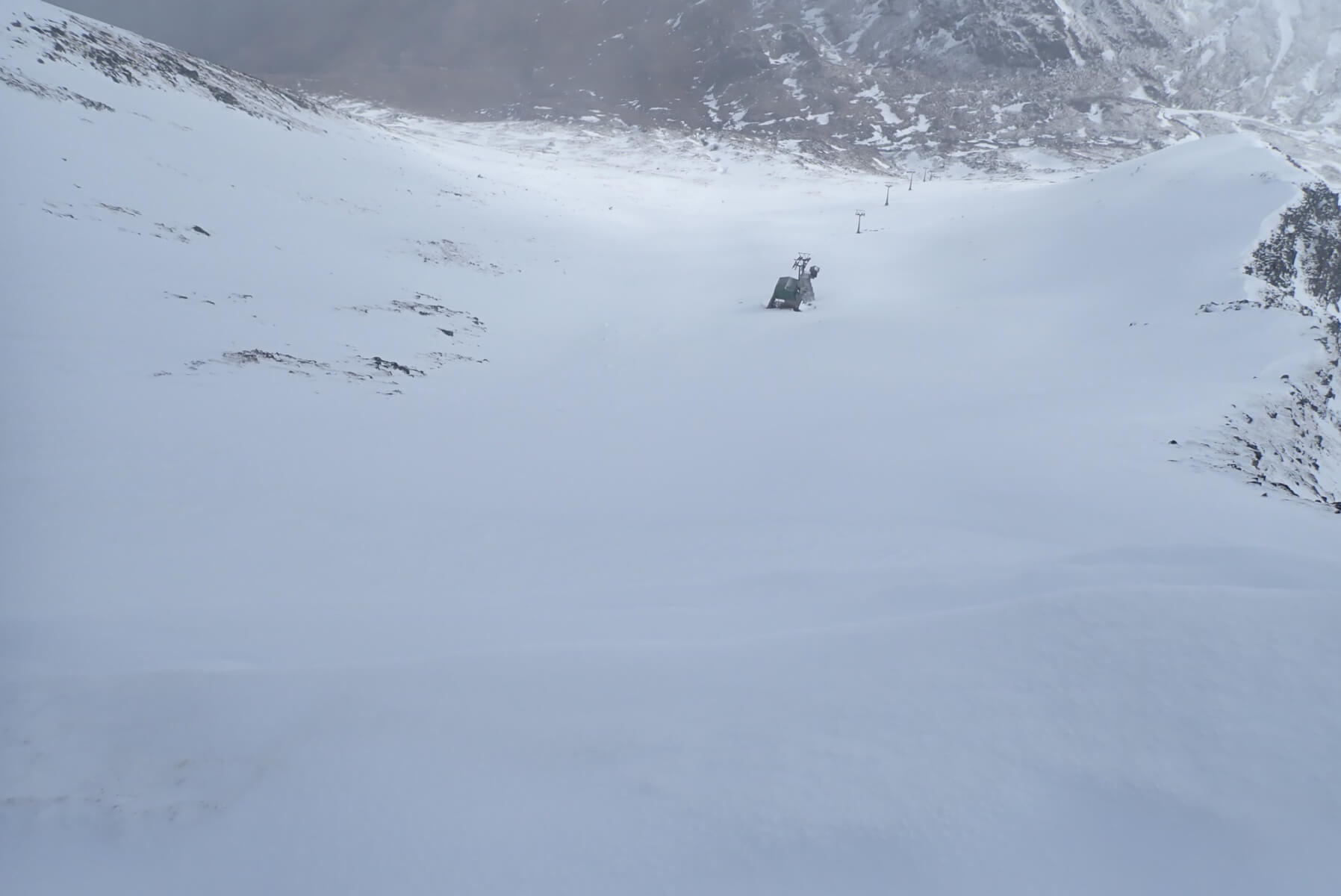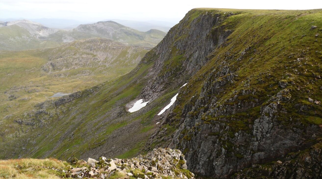 A similar view in summer. Note that this photo was taken a few years ago and some of the wooden posts have gone since then. In summer the top of the coire is quite rounded, but in the winter it becomes much more abrupt due to drifting/cornice formation.