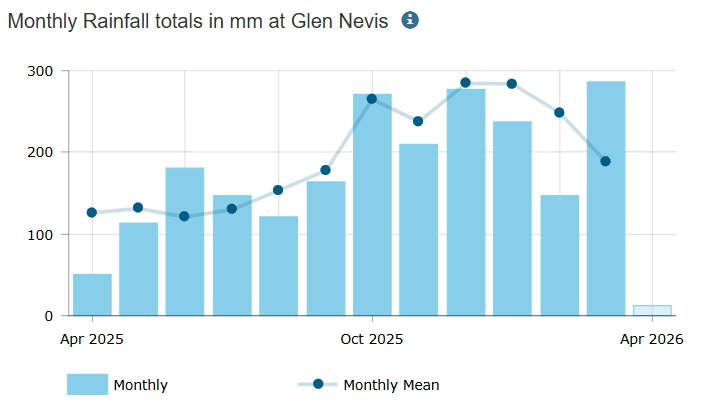 Rainfall in Glen Nevis for the last year. Each month of winter has been drier than average with the exception of March which was the wettest month in the last year.