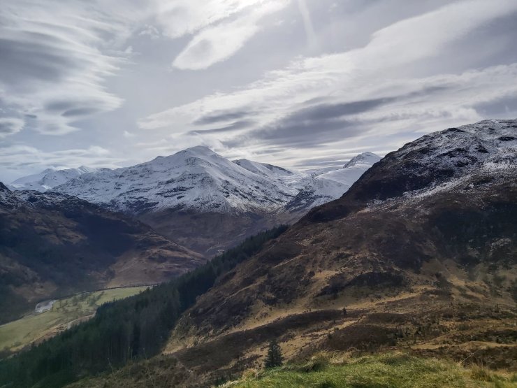 Looking up Glen Nevis to Sgurr a’ Mhaim in the Mamores. Winter in the mountains, spring in the glen.